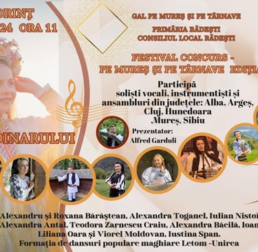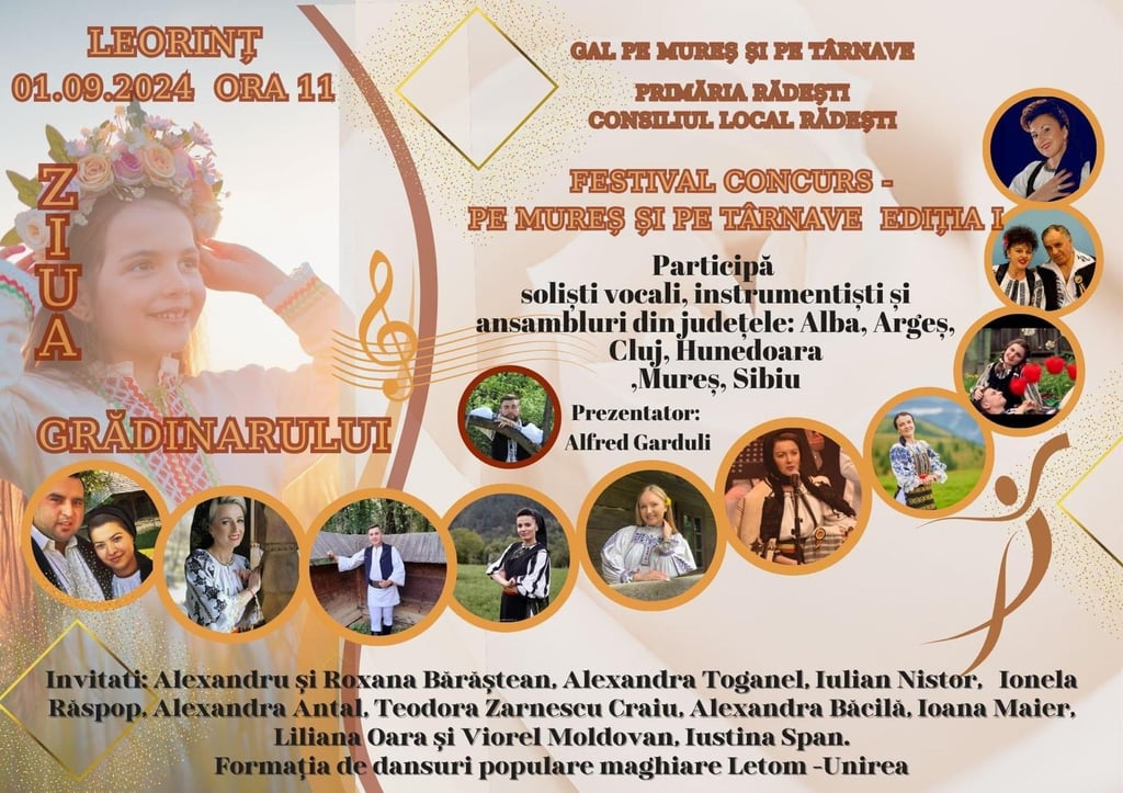 Anul acesta, comunitatea din Leorinț, comuna Rădești, județul Alba, devine centrul unui eveniment deosebit, care aduce împreună iubitorii de tradiție, muzică și cultură populară. Cu bucurie și emoție, participăm la prima ediție a festivalului-concurs "Zilele Grădinarului", o sărbătoare dedicată spiritului autentic al zonei și frumuseții obiceiurilor care ne definesc.